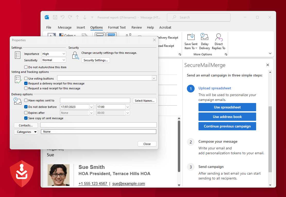 SecureMailMerge propose des fonctionnalités avancées de publipostage et des capacités qui rationalisent l’ensemble du processus, de la planification et de la personnalisation à l’analyse et au suivi pour Outlook. Ces outils vous permettent de configurer et de gérer des e-mails récurrents sans effort, vous faisant gagner du temps et garantissant l’exactitude.